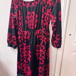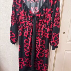 Stylish mini dress with bold red patterns. Features a flattering tie-front design. Perfect for a night out. black and red pattern and very flattering fit.