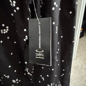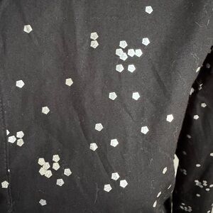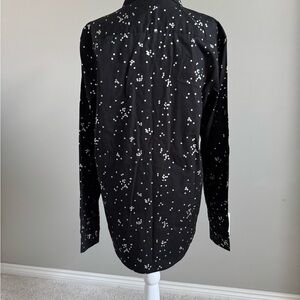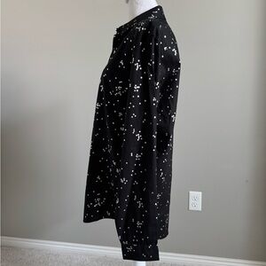This casual button-down shirt from INC International Concepts features a striking black base with a galaxy-like pattern of silver speckles. The smooth material and classic collar make it a stylish choice for any casual outing. NWT, no flaws.