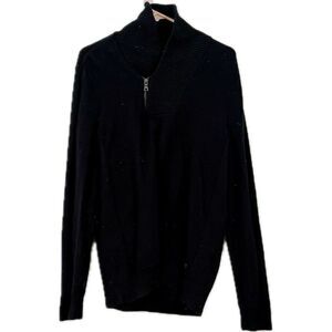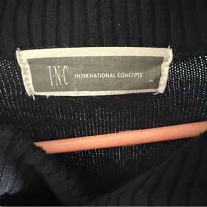This sleek black turtleneck sweater from INC International Concepts features a smooth, fine knit texture and a form-fitting silhouette, perfect for a chic and cozy look.