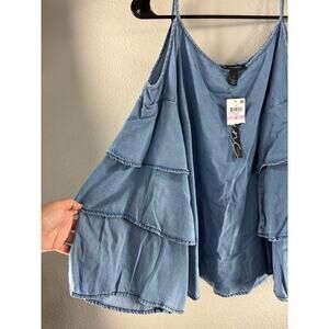 This INC International Concepts denim top is brand new with tags and ready to make a statement! It features stylish ruffled sleeves and a trendy cold shoulder design. The classic blue denim is versatile and can be dressed up or down. Perfect for adding a touch of chic to any outfit.