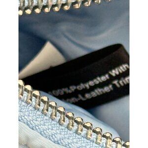 Chic quilted crossbody purse in a soft blue hue by INC International Concepts. Adjustable strap for shoulder or crossbody wear, chain detail at sides, secure zip closure and roomy interior with slip pockets. Light surface wear and mild discoloration on metal closure—see photos for details. Perfect everyday bag with a pop of color.