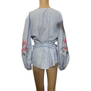 Chic wrap blouse with blue stripes. Features pink floral sleeve accents. Stylish tie waist design.