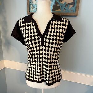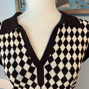 Chic diamond pattern sweater with short sleeves. Features a stylish collar and V-neck. Ideal for both casual and office wear.
