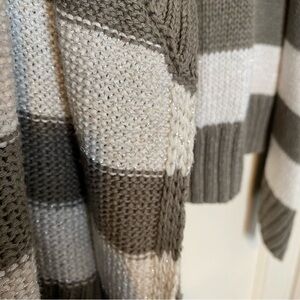 A must for your layering wardrobe for warmth and comfort. These neutral colors will accent any outfit. There is a thin silver metallic thread woven throughout. It is a size L.