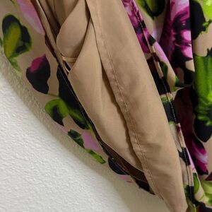 Stylish sleeveless dress with a vibrant floral pattern. Features shades of pink, green, and black.