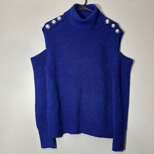 Keywords: INC International Concepts, cold shoulder sweater, turtleneck sweater, blue sweater, button detail sweater, womens sweater, knit sweater, medium sweater, fashion sweater, stylish sweater, casual sweater, winter sweater, fall sweater