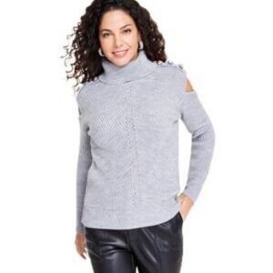 Keywords: INC International Concepts, cold shoulder sweater, turtleneck sweater, button detail, gray sweater, ribbed knit, womens sweater, medium sweater, fashion sweater, casual sweater, winter sweater, fall sweater, long sleeve sweater, statement sweater