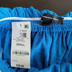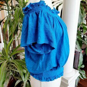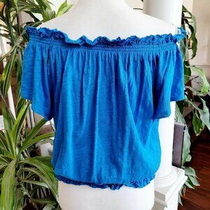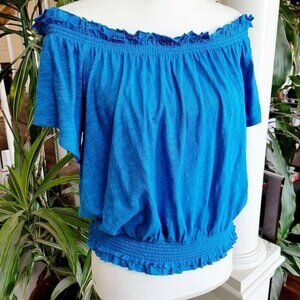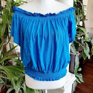 INC International Concepts Cotton Smocked Off Shoulder Peasant Top Sz Small Blue