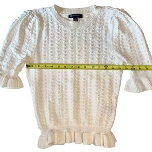 INC International Concepts knit sweater. Features a textured pointelle knit design, half puff sleeves with ruffle cuffs, and matching ruffle trim at the hem for a feminine, look. Minor discoloration on collar (see photos).