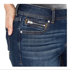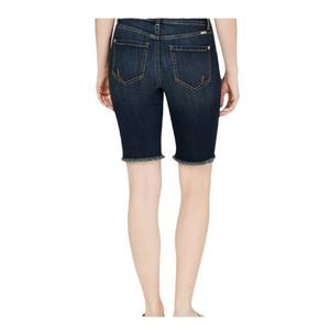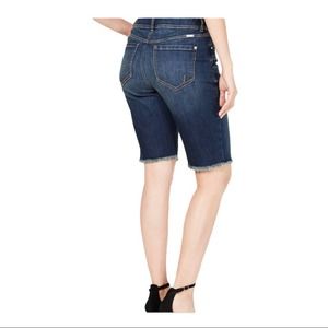 INC International Concepts Denim Bermuda Shorts in Curvy Fit. Mid rise. Raw hem with whiskering and faded details. Zipper detail over front pocket. Zipper and button closure at front. Belt loops. Color: Dark Wash.