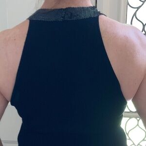 Worn once! This sexy, stunning low cut top from INC International Concepts has shiny black sequins covering the entire front and wraps around the back collar. The stretchy material is very forgiving and comfortable to wear.