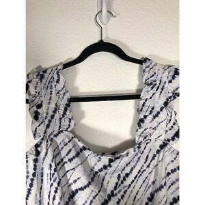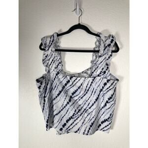 This tie dye top is perfect for the warm season. It is a white base with a blend of blue and perfect tie dye. It is a fun and dramatic look without being over the top. The straps feature a ruffle accent that make it ultra feminine. The material is lightweight and machine washable. New with tags, no rips, stains or damage.