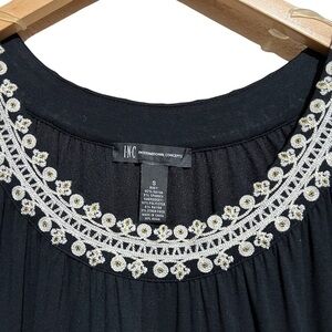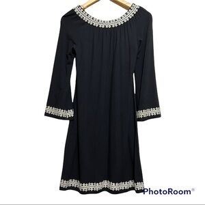 Black knit dress with embroidered and gold detail. 3/4 sleeves, rayon and spandex. Fully lined