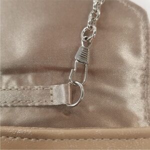 This chic tan clutch showcases a glossy finish and an envelope-style design with a pointed flap closure. The metallic V-shaped accent adds a touch of elegance, while the thin chain strap allows for versatile carrying options. Perfect for elevating any outfit, this clutch is a must-have accessory.