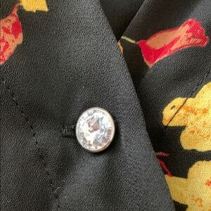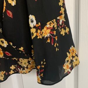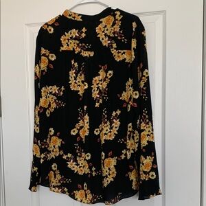 Elevate your style with this elegant floral top. Featuring a striking black base adorned with vibrant yellow flowers, this piece is perfect for any occasion. Pair it with your favorite jeans or skirt for a chic look. Chiffon like fabric. High in the front and lower in the back. Size 1X. Excellent condition. Loose fit. (See photos)