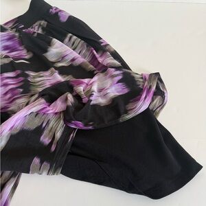 INC International Concepts Stylish skirt with a floral print. Features black and purple colors. Plus size. Sheer outer fabric with black knit lining fabric. Elastic waist. Pull on style. Size 2X. Color Purple and Black floral. 100% Polyester Shell, 100% Nylon lining. No pockets. Roomy around hips.