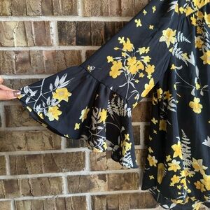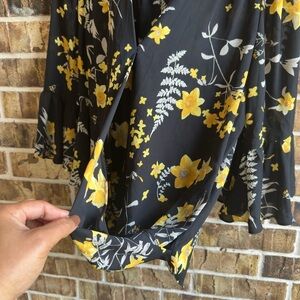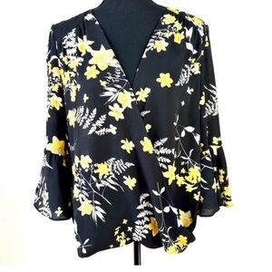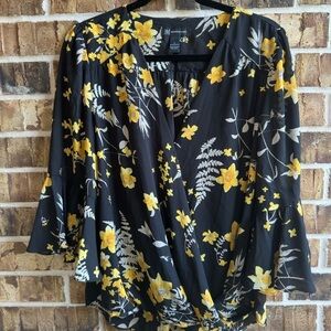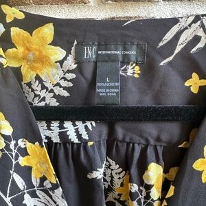 This stylish blouse from INC International Concepts showcases a vibrant floral pattern on a black background, highlighted by yellow blooms. The wrap-style design and 3/4 sleeves offer a chic and comfortable fit, perfect for any occasion.