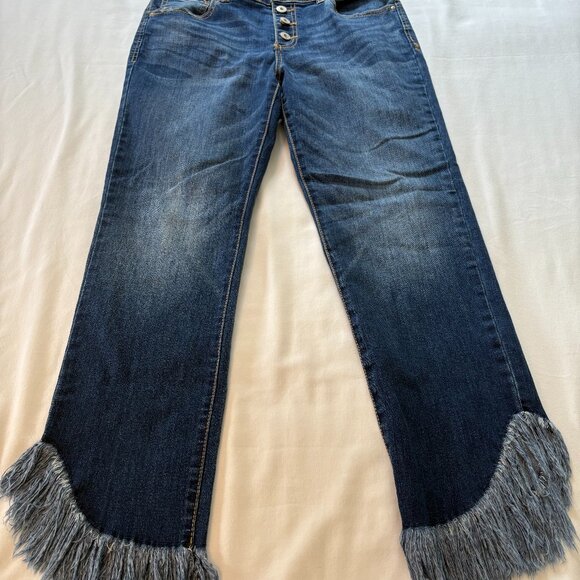 Medium wash denim jeans with an extravagant fringed hem. Straight leg, regular fit styling with a 4-button fly, front pockets and 2 patch pockets in the back. Fabric is 67% Cotton, 29% Polyester, 2% Spandex, and 2% Other Fiber for easy care machine wash and machine dry. Size 6 with measurements taken flat and unstretched: Waist 14", Front Rise 9", Inseam 24" to Top of Fringe and 26" to Bottom of Fringe. In excellent preowned condition.