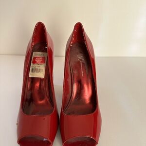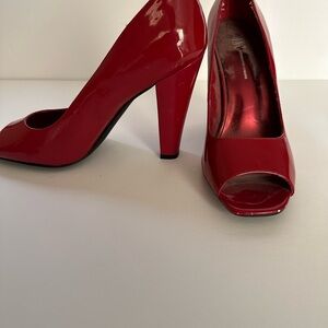 Elegant glossy red heels with peep-toe design. Ideal for stylish outings.