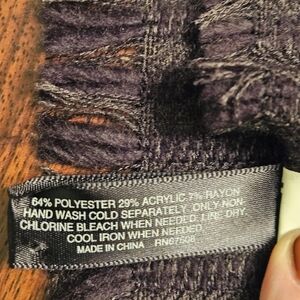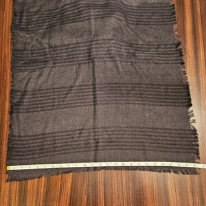 Dark gray with dark brown/burgundy stripes, small fringe all around. Rectangular, warm, soft. Acrylic, polyester, rayon blend.