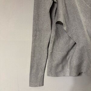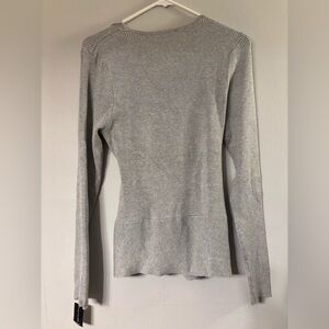 Stylish gray long sleeve top. Features a wrap design. Ribbed texture adds elegance. Perfect for casual or dressy occasions.