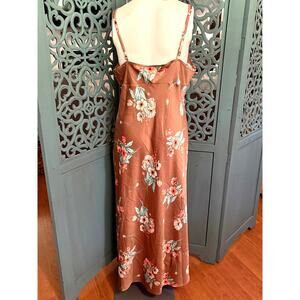So beautiful! These colors look great on just about everyone with dark or light skin. Soft satiny feel polyester fabric is machine washable. In 'like new' condition with no stains or other damage. There is a sheer line of fabric from shoulders to bodice along front V-neck that is outlined with coral fabric. The back has thin adjustable straps.