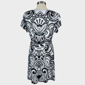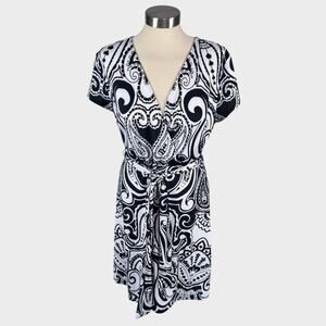 INC International Concepts L Black White Pattern V Neck Dress Belted