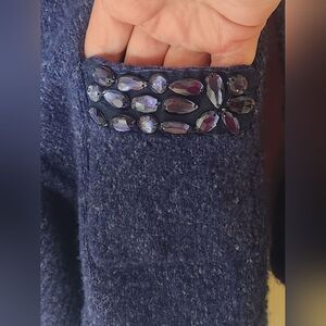 INC International Concepts L Navy Blue Longsleeves Ruffles WOOL Blend Pockets Rhinestones Women's Cardigan