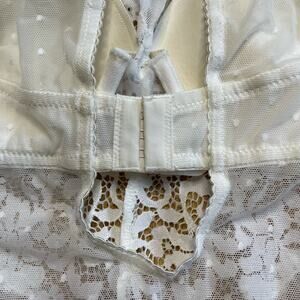 New with tags white lace bodysuit from INC International Concepts, size small. Made of sheer stretch mesh with swiss dots, padded underwire cups, long keyhole back, lace overlay, and thong back.