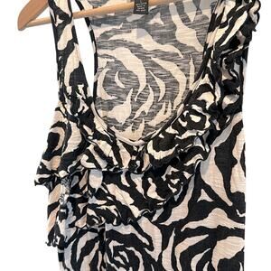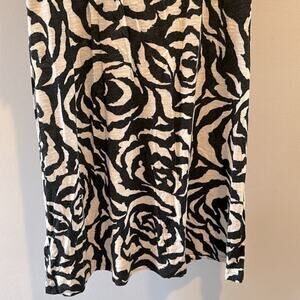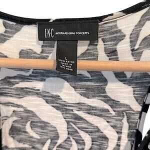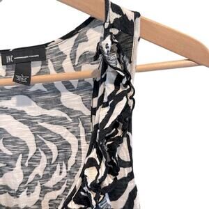 Like new condition INC International Concepts dress, worn once. Women’s size large and has a contemporary/abstract floral print in class black and taupe/cream making this a versatile option for lots of occasions. Dress is sleeveless with a low scoop neck and racerback. The most unique feature is the ruffled tiers of material just under the neckline and across the midsection. Very lightweight dress and easy for travel since fabric doesn’t hold wrinkles and has an almost heathered fabric (shown in up close photo) that provides some texture and makes for a flattering fit. Great option for a business event or a semi-casual wedding/special occasion as it can be easily dressed up or down with a sandal or heels.