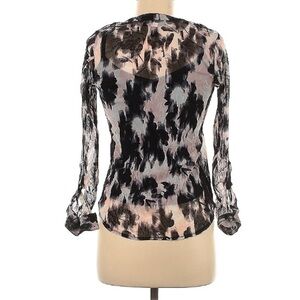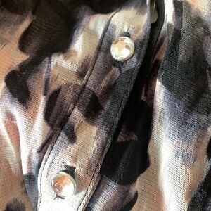 Abstract art print button down long sleeve blouse lined with tank top under layer preowned good condition no holes or stains 100% nylon outer