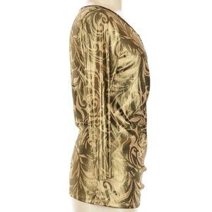 Elegant top with metallic gold and brown swirl design. Ideal for a sophisticated style.