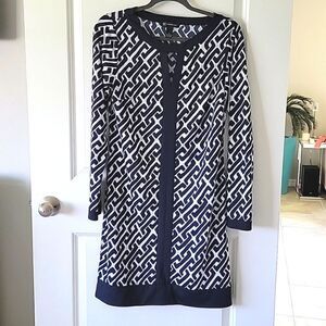 INC International Concepts Navy and White Geo Long Sleeve Stretch Dress - Medium