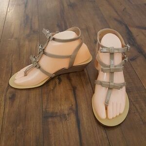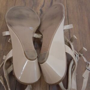 Like new. Three strap style with bows. Double strap adjustable closure. Patent man-made leather. 2 inch wedge.