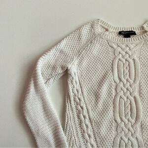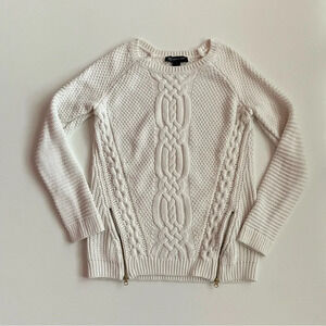 The classic cable knit of this sweater are just one unique design detail. The two gold zippers at the hemline provided an effortless, chic accent. Classic scoop neckline and ribbed hemline.