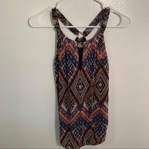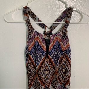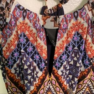 Great condition. INC International Concepts.Printed Keyhole Halter Top. Sleeveless. High neck with v cut out. Racerback with triangular metallic detail. Multicolor blue, orange, pink and white geometric overlay. Lined. Size XS. 100% nylon. Pit to pit laying flat 17” Shoulder to hem 25”. All measurements are approximate and taken lying flat. Smoke free home. No trades, offers welcome.