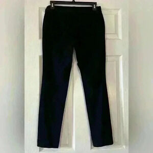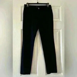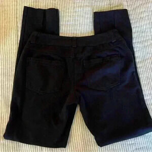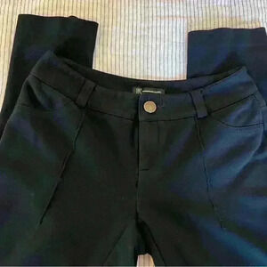 INC International Concepts Black Skinny Pants, Women's Size 0. No front pockets, has back pockets. Zip and button closure, and belt loops. There is a seam up the front of each leg. 65% Rayon, 30% Nylon. The material of the pants is similar to cotton leggings, but thicker. Comfortable pants.