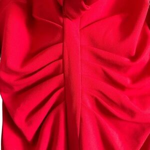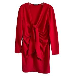 Plunging V neck real red dress, drape tie front with ruched / gathering, side zipper, lined