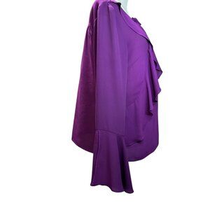 Add a bold touch to your wardrobe with this pre-owned INC International Concepts blouse in a vibrant royal purple hue. Designed with soft, flowing fabric, this long sleeve blouse features dramatic layered ruffles down the front and playful bell cuffs for an eye-catching finish. The keyhole neckline with tie closure adds an elegant touch, making it perfect for both office wear and date nights. Lightweight and unlined, this top offers comfort without sacrificing style.