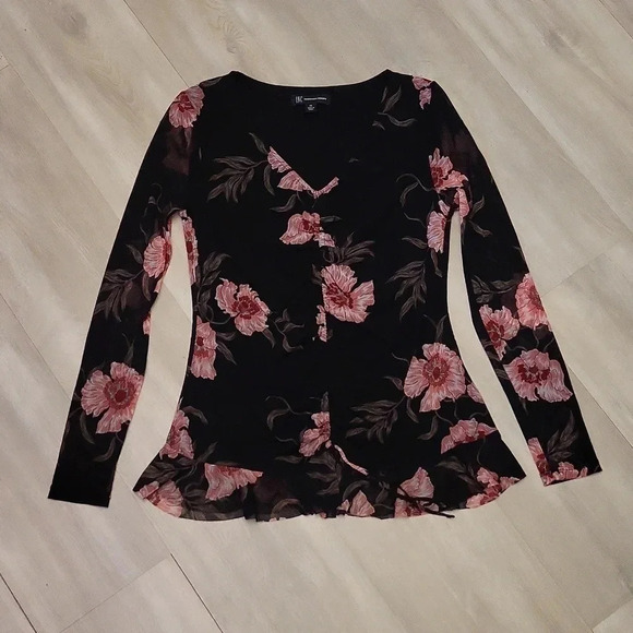 🛍INC International Concepts Sheer Sleeved Black Floral Blouse Womens Size XS