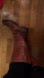 Elegant tan leather upper with fabric lining. Comfortable and stylish. Riding style brown leather boots, good preowned condition.