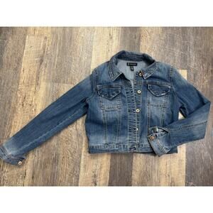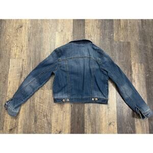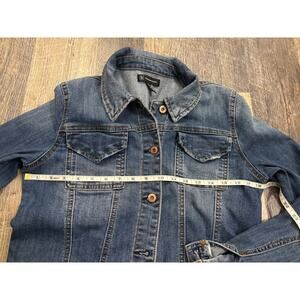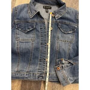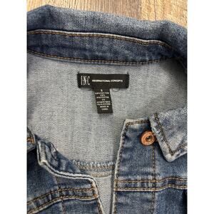 A stylish women's denim jacket by INC International Concepts, featuring classic button closures and a medium wash. Perfect for casual outings and layering in cooler weather. It is a size small and is in excellent used condition.