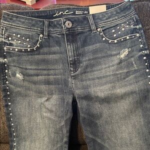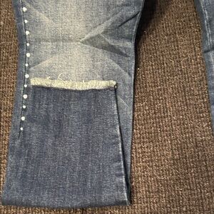 Stylish blue skinny jeans with pearl embellishments. Distressed details for a trendy look. Perfect for casual wear.