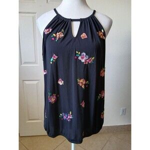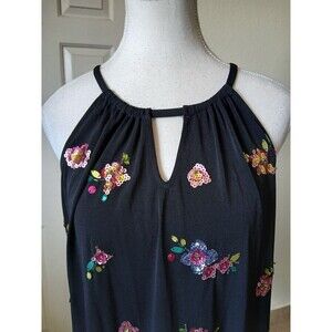 The INC International Concepts Women's Embellished Bubble Hem Halter Top in Black PXL is a stylish blouse perfect for various occasions such as parties, casual outings, formal events, workwear, and business meetings. Made of 96% polyester and 4% spandex, this sleeveless top features a floral pattern with sequin accents, adding a touch of glamour. The halter neckline and button closure give it a chic and feminine look, making it a versatile piece for the summer, fall, and spring seasons. Perfect for petite women who appreciate basic yet trendy style options.
