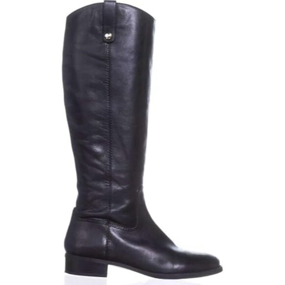 These are black leather knee-high riding boots.They feature a round toe and a low block heel.A half-zipper closure on the side makes them easy to wear.