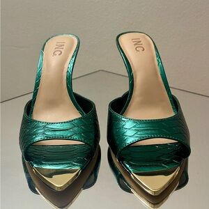 Chic metallic green heels with peep-toe design. Features a sleek stiletto heel. Perfect for elevating any look.