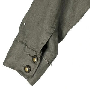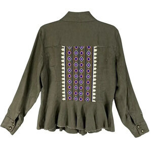Linen jacket embroidered jacket olive green peplum hem INC women's fashion button-down long sleeves casual wear chic style large size artisanal design nature-inspired