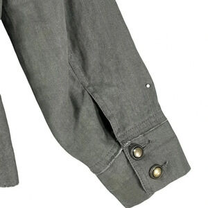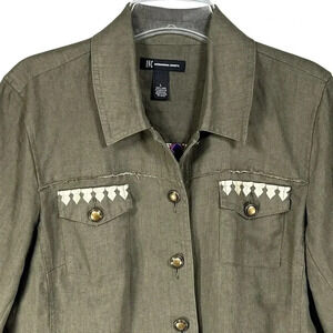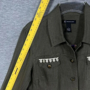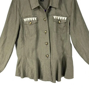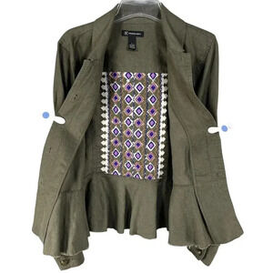 INC International Concepts WomensSize Large Olive Green Linen Embroidered Jacket Peplum Hem