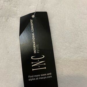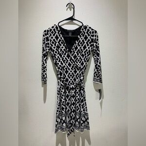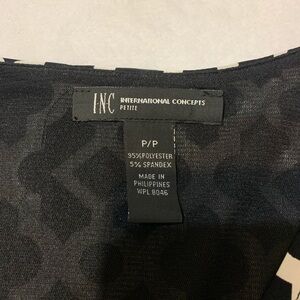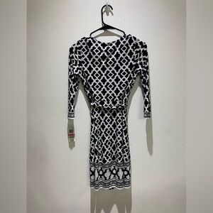 This is an INC International Concepts women's dress in size P/P, which stands for petites. The dress features long sleeves, a V-neckline, and falls at knee length in a casual A-line style. The color of the dress is black and white, making it versatile for various occasions. It is brand new with tags, perfect for those looking for a chic and comfortable wardrobe staple.
