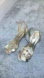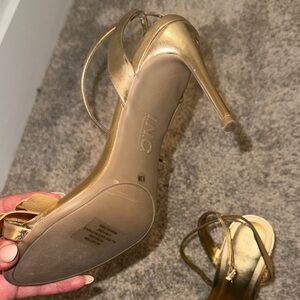 Elegant metallic gold heels with floral accents. Perfect for special occasions.
